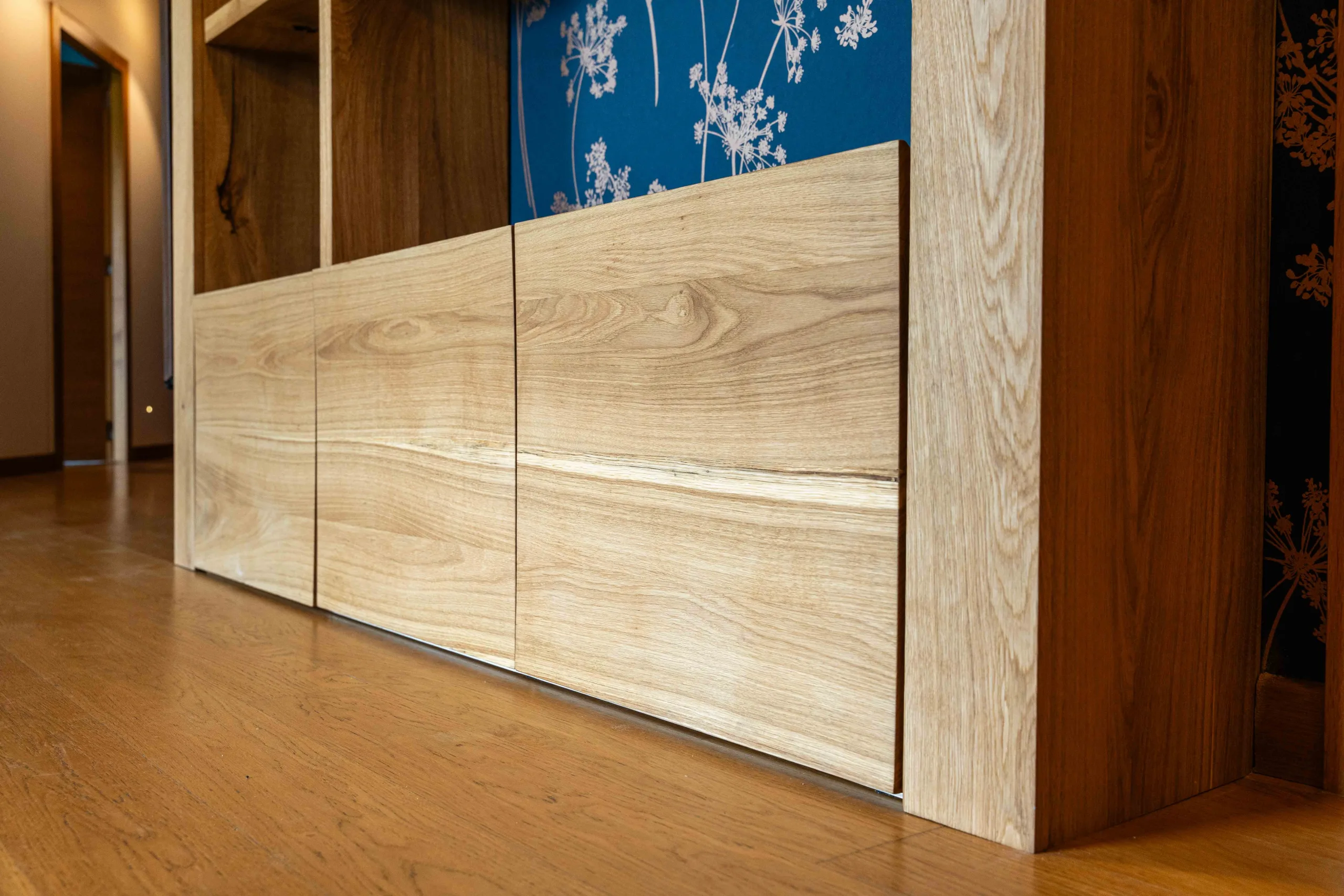 bibliotheque design et moderne sur-mesure en chêne clair avec étagères et tiroirs en bois