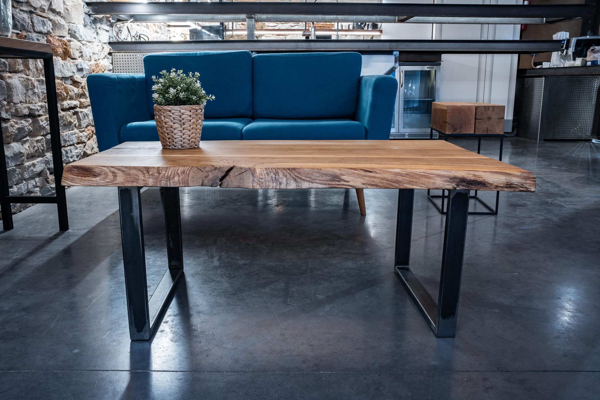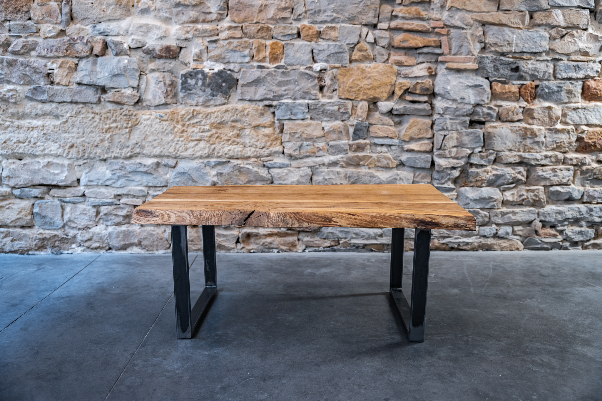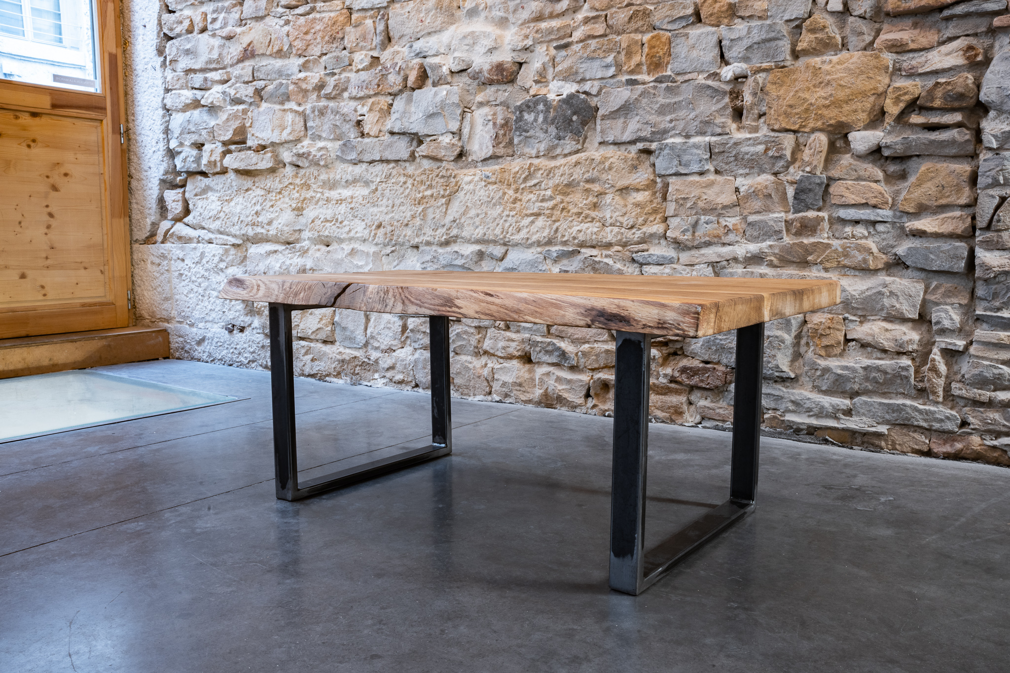 Le plateau est réalisé en chêne massif, soigneusement sélectionné pour la beauté de son grain et sa robustesse naturelle. Chaque planche est poncée, ajustée et assemblée à la main par l’atelier Boyet, ébéniste et métallier à Lyon. Nous avons laissé les irrégularités naturelles du contour du bois. C’est ce qu’on appelle des bords « live edge » (bords bruts).