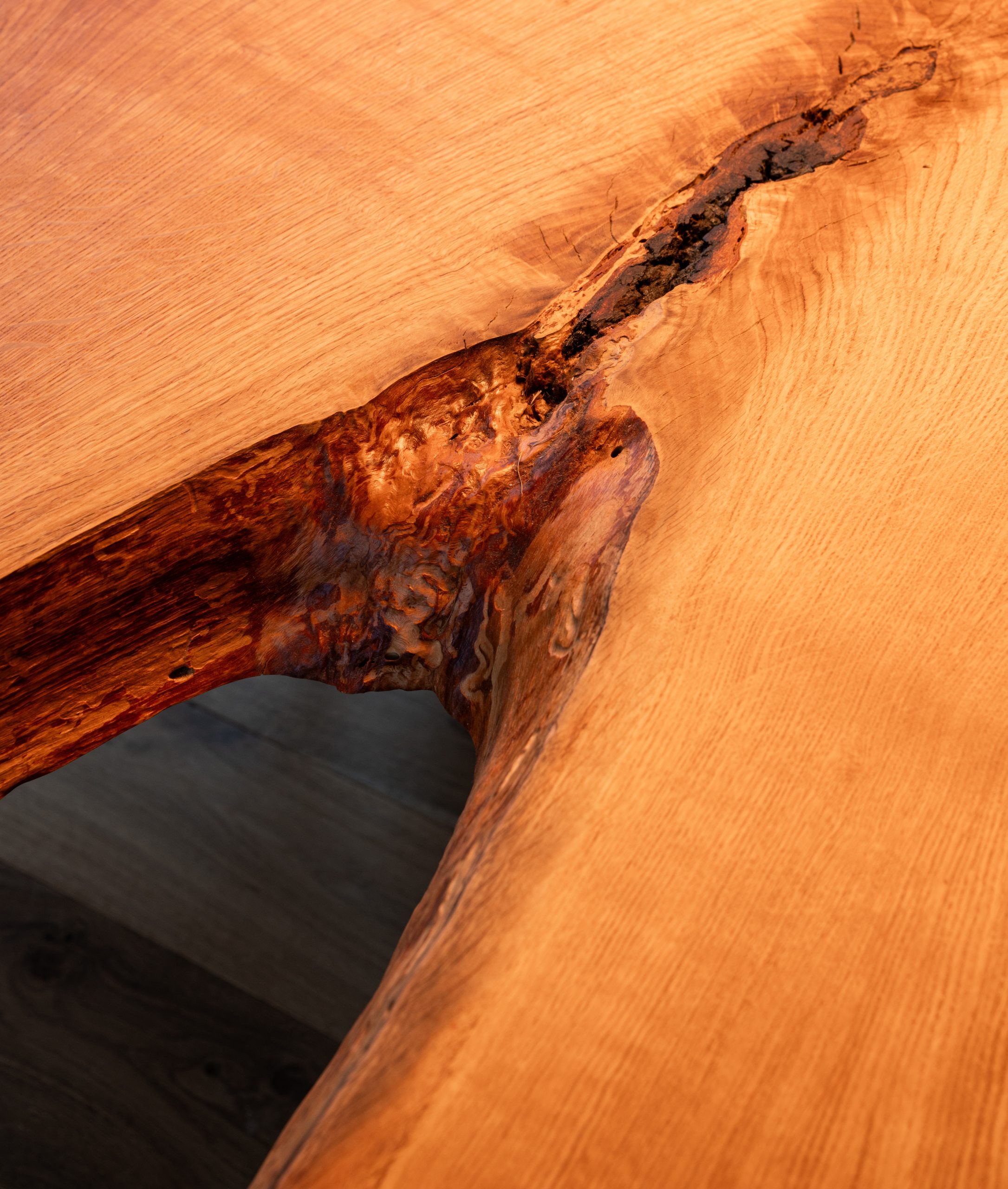 Zoom sur une planche de chêne massif de 4 mètres de long et sa fente naturelle